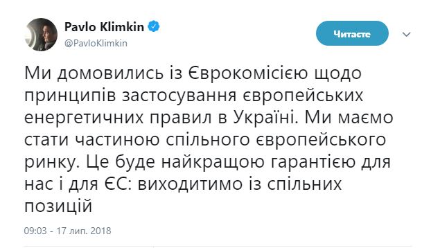 По словам Климкина, стороны договорились с Еврокомиссией о принципах применения европейских энергетических правил в Украине.